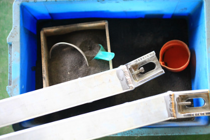 ● 削り出したエンド部分とサイドメンバーを溶接 いよいよタテ曲げに入りますが、綺麗に曲げる ために定番の砂を詰めます、使用する砂は、 色々試した結果,桜島の火山灰を、KOで硫黄抜き 、火山灰は採取した場所で細かさが違うので、 数か所のポイントで採ったものを試し、結果が 良かったものを採用。 砂詰めは、空洞を作らないことが肝心 そのためにオリジナルの治具を使うんですが、 お見せできないのが残念 スイングアーム作りは、㊙が多いです。(笑) |