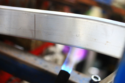 ●タテ曲げ加工中 KOレーシングでは、加熱にカロリーの高いアセチレン は使いません。 体重をかけて曲げているところもあるようですが KOでは、油圧で力を加える治具を製作し、数値で 曲がり具合を確認できるようにしています。 |