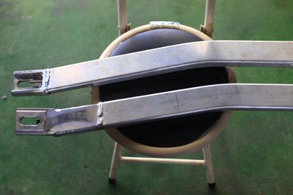 ●タテ曲げの完成 図面通りの曲げができました。 裏側エンド部分が長いのは、溶接部の長さを確保して 接続強度を上げるためです、ただの突合せ溶接 ではありません。もちろん内部は肉抜き加工して 軽量化も抜かりなく。。 この後 横方向の曲げに移ります、 トライアルバイクのスイングアームは、ほとんど 左右対称ではなくここでもCAD図面での数値が 重要になってきます。 |