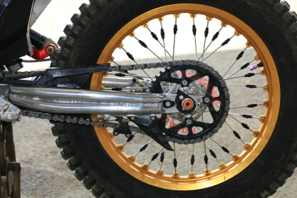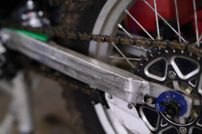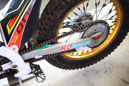 装着状態 スピンドルシャフトも中空構造 チエン調整も、一般的なスネイルカムタイプに変更 テンショナー位置も、標準より後ろに移動、 これにより障害物にあたりにくく成りました。 ホイルはRTLのもの、純正比600g軽量。 8年間 地方選手権 全日本選手権で使用しましたが 曲がり ひび割れなどの不具合は皆無! |