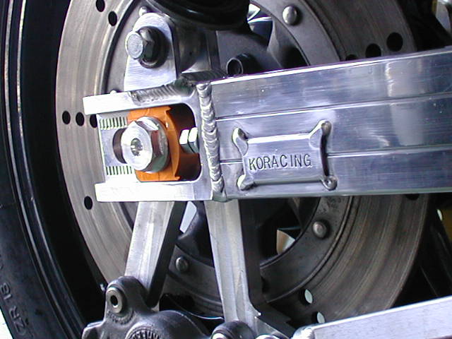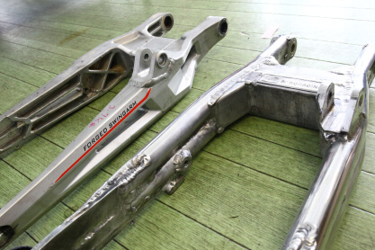 | ●スイングアームは、ノーマルでもアルミですが、 生産性を顧慮したアルミ鋳物で非常に重たく、それも A7N01の角パイプを使い製作。1キロ以上の 軽量化達成。 よく見ると、バナナ形状になり、エンド部分には 割を入れて、細くなるようにしています。 車両は、KOレーシングで見れます。 |