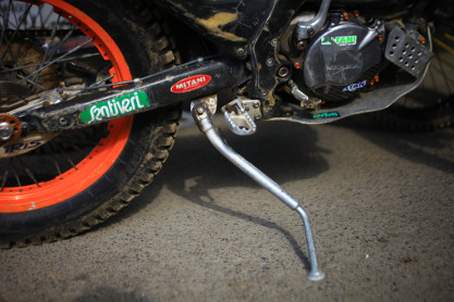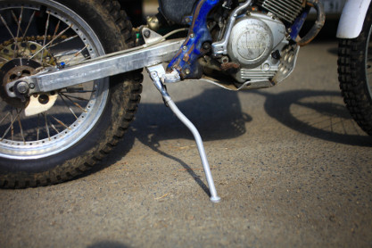 ● 長年使用した他社製のアルミサイドスタンド 数か所に曲がりとピポット部の摩耗により、大きく 傾き今にも転倒しそうなまでに傾いてしまったバイク |