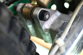 | ショックマウントも当然A7N01材 ノーマルより強度のある素材 ですから必要にして十分な厚み。 ボルトとのガタを無くすために、工作機械で使われるコレット チャックの原理を利用した特殊なワッシャーをはさみ、がっちり とねじを咥え、いやながたつきはゼロ。 クロスメンバーは、縦日の字断面 補強は、ノーマルでは、 空洞になっているためマディーセクションで土が堆積して 重くなる現象を無くすため、BOX形状に。 |