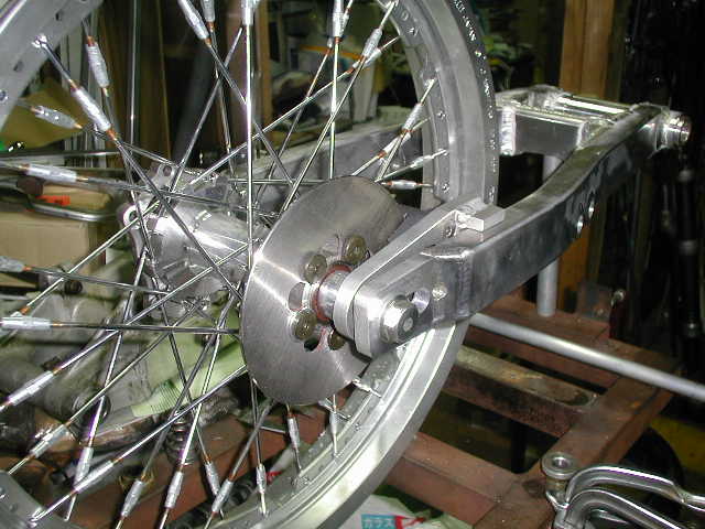 | ●右の写真は、現在製作中のスイングアーム キャリパー部分も内側にはいるように加工。 アクスルシャフト貫通部分から全部7N01。 特注品。 |